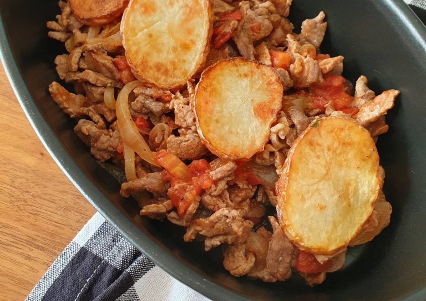 - Pasando los 5 minutos apagas el fuego y por encima de la carne colocar las papas previamente cocinadas, y tapar.