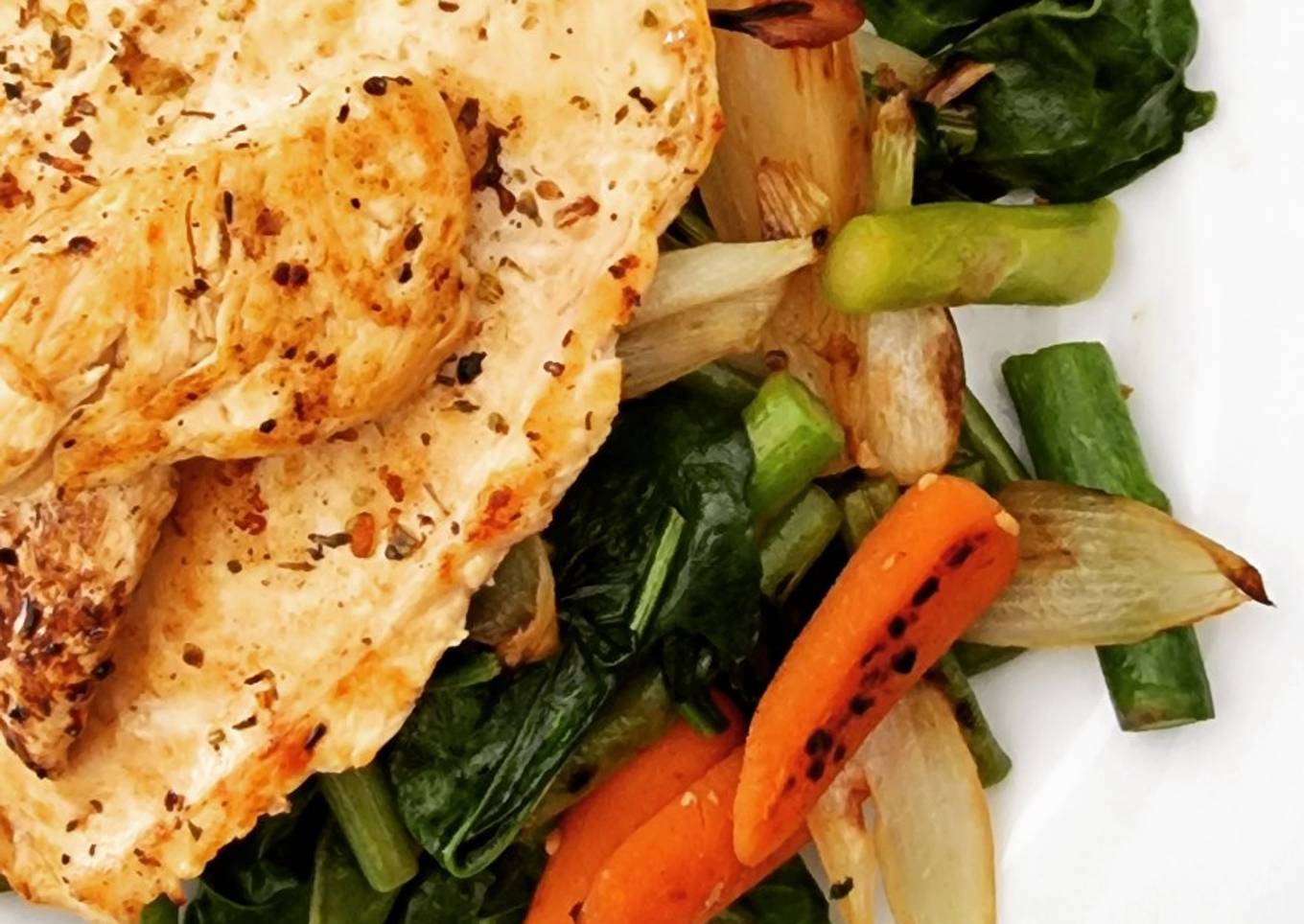 - Asa la pechuga de pollo y emplata primero las verduras y encima la pechuga.