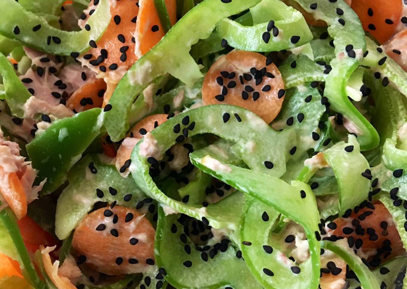 - En un recipiente hondo mezcla el atún, las láminas de zanahoria y de pimiento.