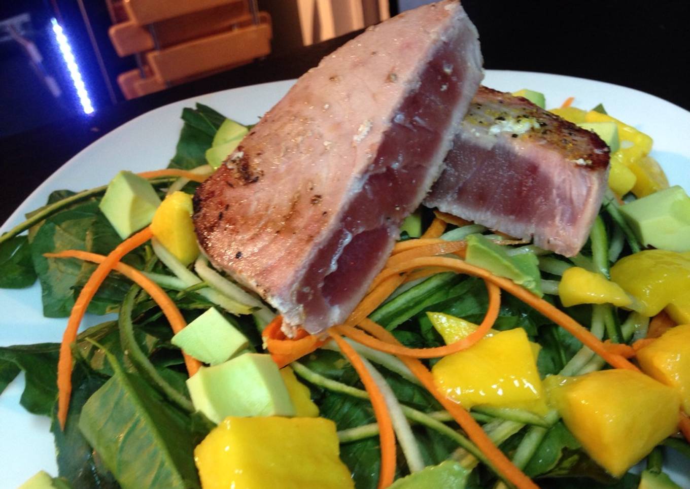 - Montaje : primero coloca la espinaca, después las julianas, el mango, aguacate y por último el atún con un corte central para ver en término del atún