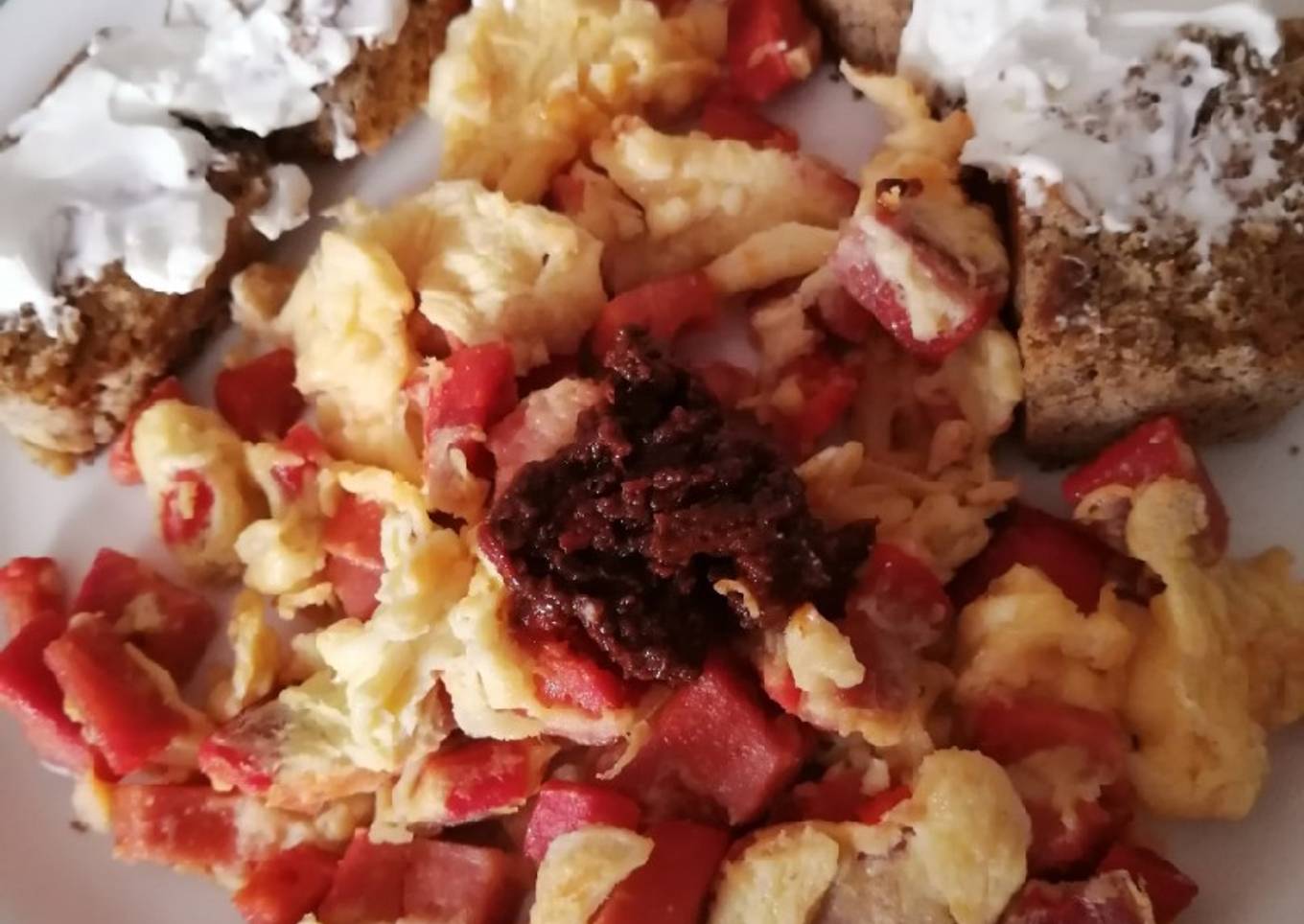 - Se cocinan los huevos al gusto. Acompañé con pan de harina de coco y linaza untado con queso crema. Agregué un poco de salsa misanteca.(https://Cookpad.com/mx/recetas/8063337)