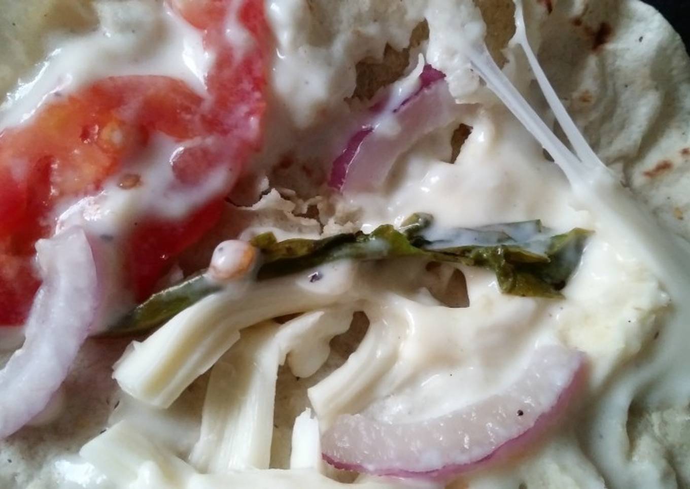 - Calentar las tortillas, colocarles hebras de queso, cebolla, jitomate y 1 hoja de epazote, y una cucharada grande de salsa bechamel.
