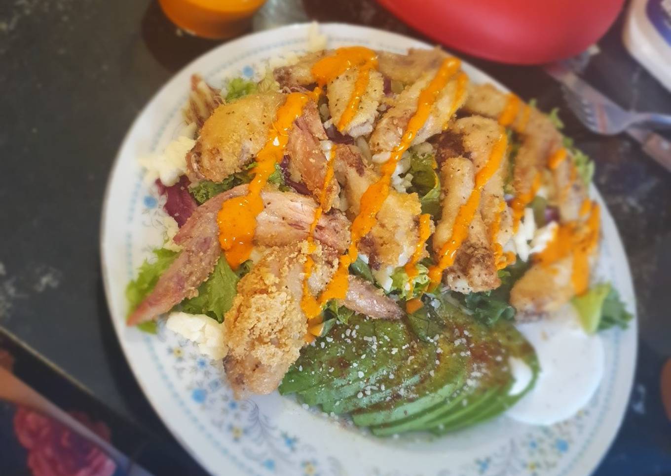 - Preparamos nuestro plato con medio aguacate (sazonado con queso parmesano y sal de ajo con páprika, para acompañar), también un mix de lechugas con queso mozzarella como cama para las alitas.
