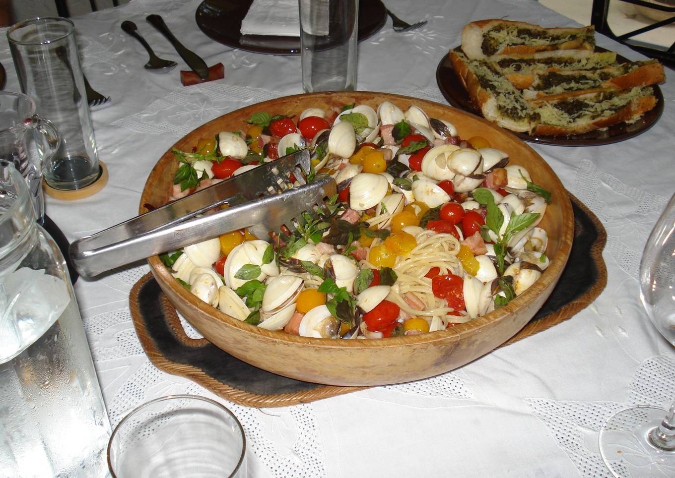 Espaguetis con una salsa de almejas, tomates, tocino y vino.