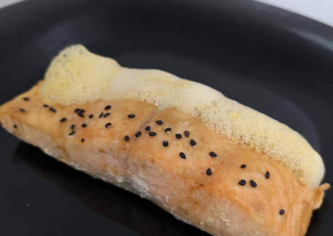 - Cortar y servir el salmón, encima usar la espuma, se puede decorar con ajonjolí.